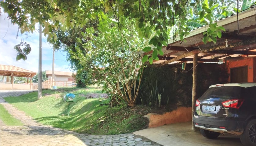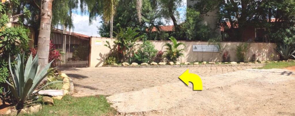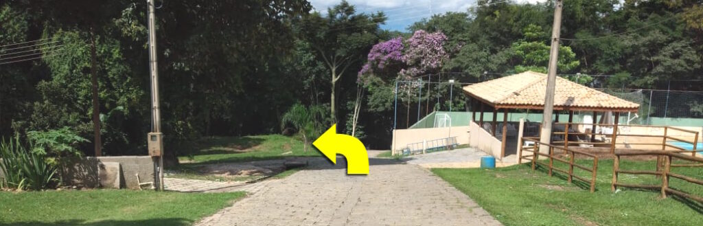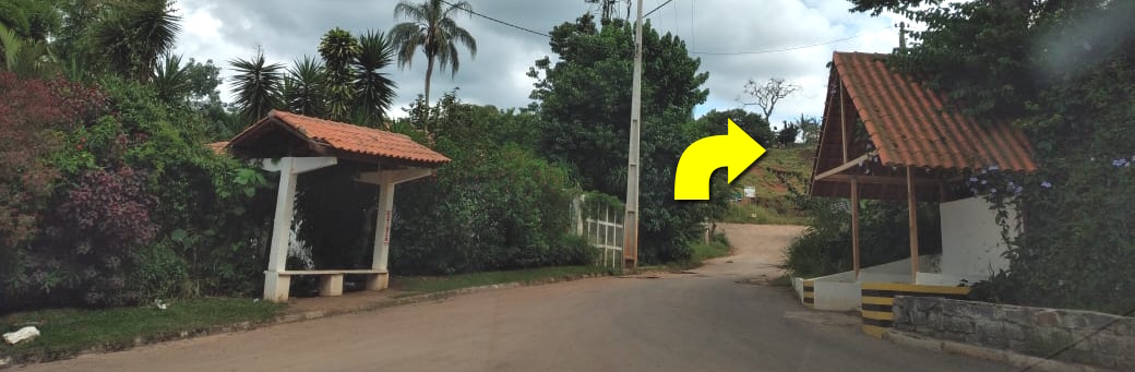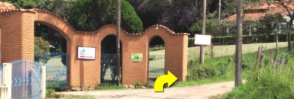 Descer 1ª ladeira calçada e continuar até o portão da Aquamarina. Subir 2ª ladeira calçada.